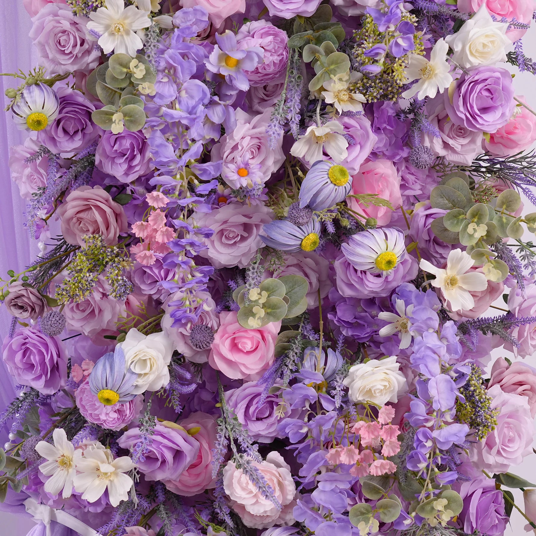 Transform your wedding venue into an enchanting floral sanctuary with this sophisticated backdrop arrangement. Featuring a harmonious blend of lavender roses, delicate delphiniums, and lush greenery, this design creates a dreamy purple palette that photographs beautifully and complements any wedding aesthetic. Perfect as a ceremony backdrop, reception focal point, or photo opportunity station, this arrangement combines romantic elegance with professional floral artistry. Each stem is carefully selected and arranged to ensure lasting freshness throughout your celebration, making it an investment in unforgettable moments.
