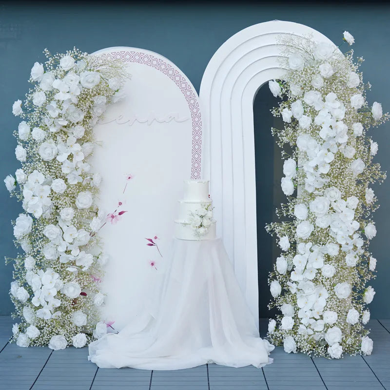 Create an elegant focal point for your ceremony or reception with this sophisticated floral backdrop. Featuring premium white roses, delicate orchids, and airy baby's breath, this arrangement combines classic romance with modern design sensibility. The lush composition provides stunning photography opportunities while serving as a versatile backdrop for vows, toasts, or guest interactions. Perfect for intimate gatherings or grand celebrations, this piece elevates any wedding aesthetic with timeless botanical elegance and refined craftsmanship.